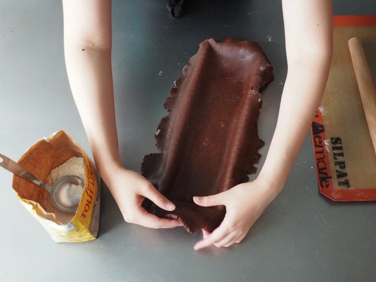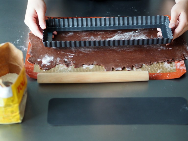 - Roll out the dough in the shape of your tart pan. Make sure you have about 2-inches more dough around the edge of your pan. You don’t want your tart more than ¼-inch thick. I rolled the dough on a silicone mat to make the transfer to the pan easier.