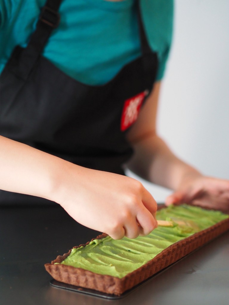 - Seriously easy now. Scoop some of that bright green pastry cream into the chocolate tart. Give it an even layer by spreading it around using a rubber spatula.