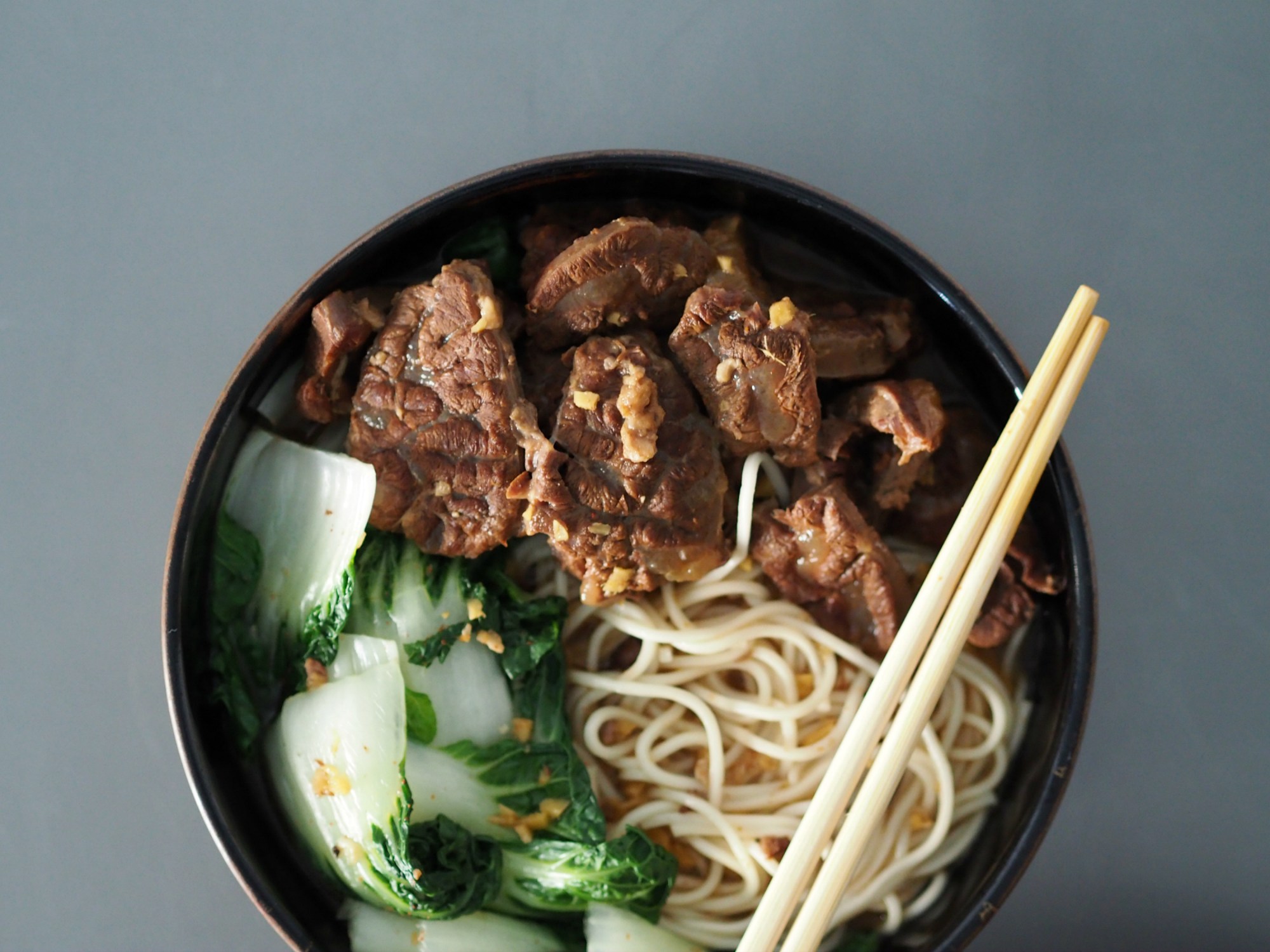 - Boil some water and blanch the baby bak choy. Take them out with a slotted spoon and set aside. Then boil the noodles in the same pot of water that is now saturated with all that vegetable goodness in it. Drain and divide into servings. Place the bak choy on top, along with some slices of beef, and ladle in the hot broth over until just about covered.