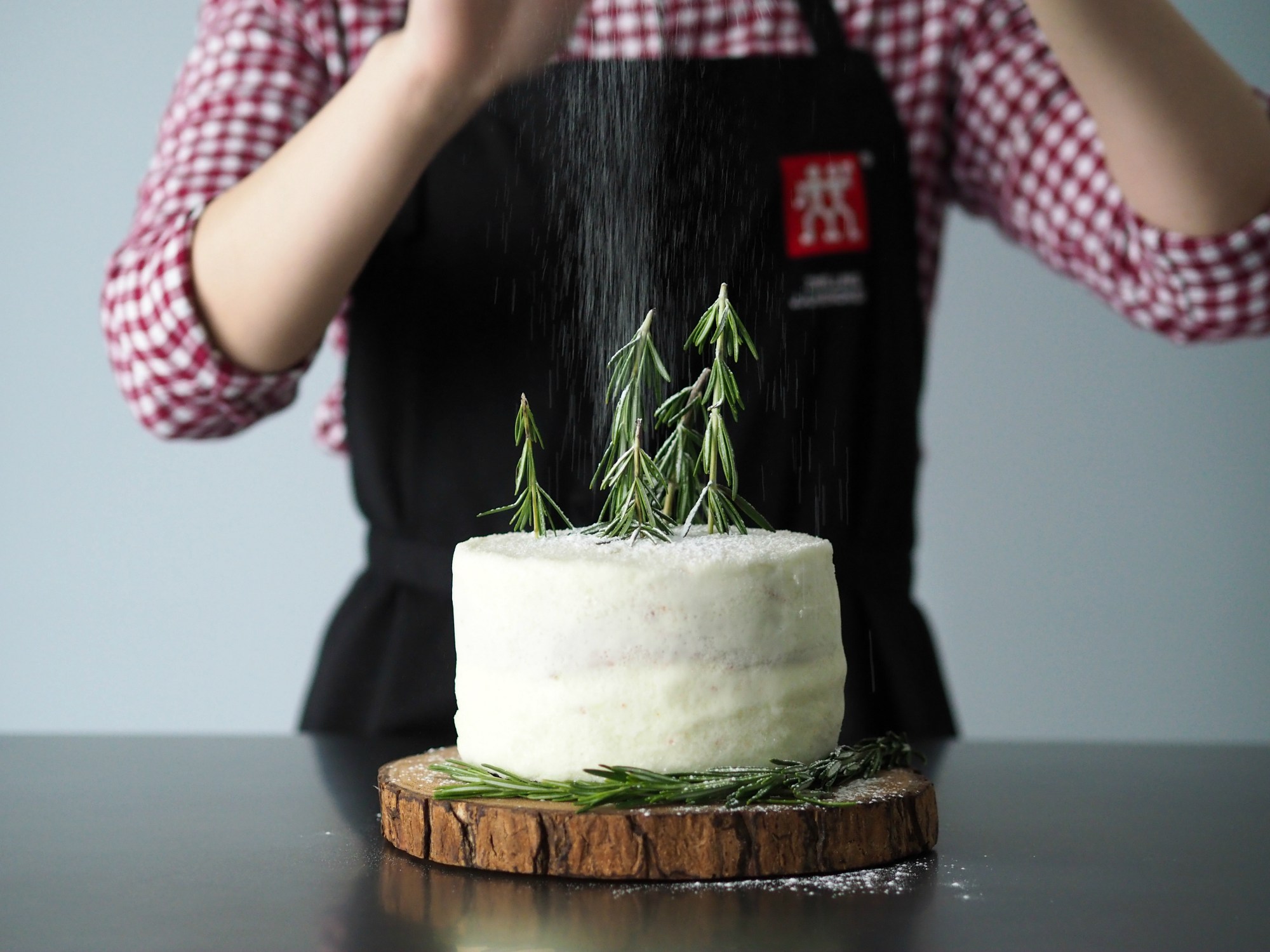 Okay, giving the cake a smooth finish wasn’t easy (still need Santa to bring me that bench scraper) and I think my cake is a little slanted, but it’s totally going for that rustic look on purpose (shhh). Making the sprinkles stick to the sides wasn’t easy either, I really need to read up on that because I had sprinkles all over the floor after. But you know what was easy? Sticking five rosemary sprigs on top. That I can do without any problems. I gave the rosemary a wash, dried them thoroughly, and then plucked off a few leaves so that I would have a stalk. Gave the “trees” varying heights and tried to look for ones with a thicker stalks.
