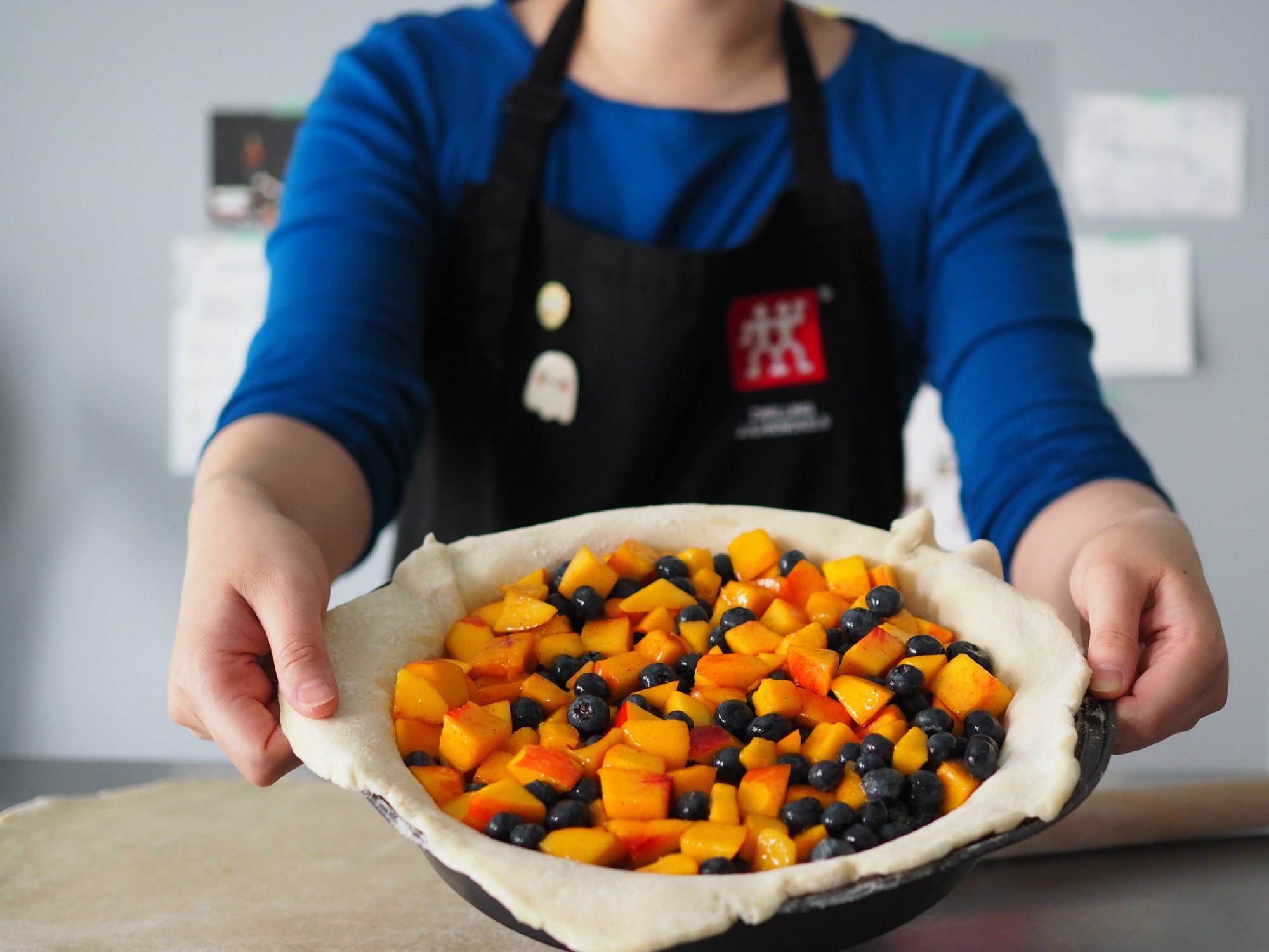 - After covering the bottom of your pan with the dough, pour in the nectarines and blueberries. Let it chill in the fridge and take out the second disc of dough to work on the pie lattice. This is also a good time to start preheating your oven to 425°F, make sure to position the oven racks to the bottom and center positions.
