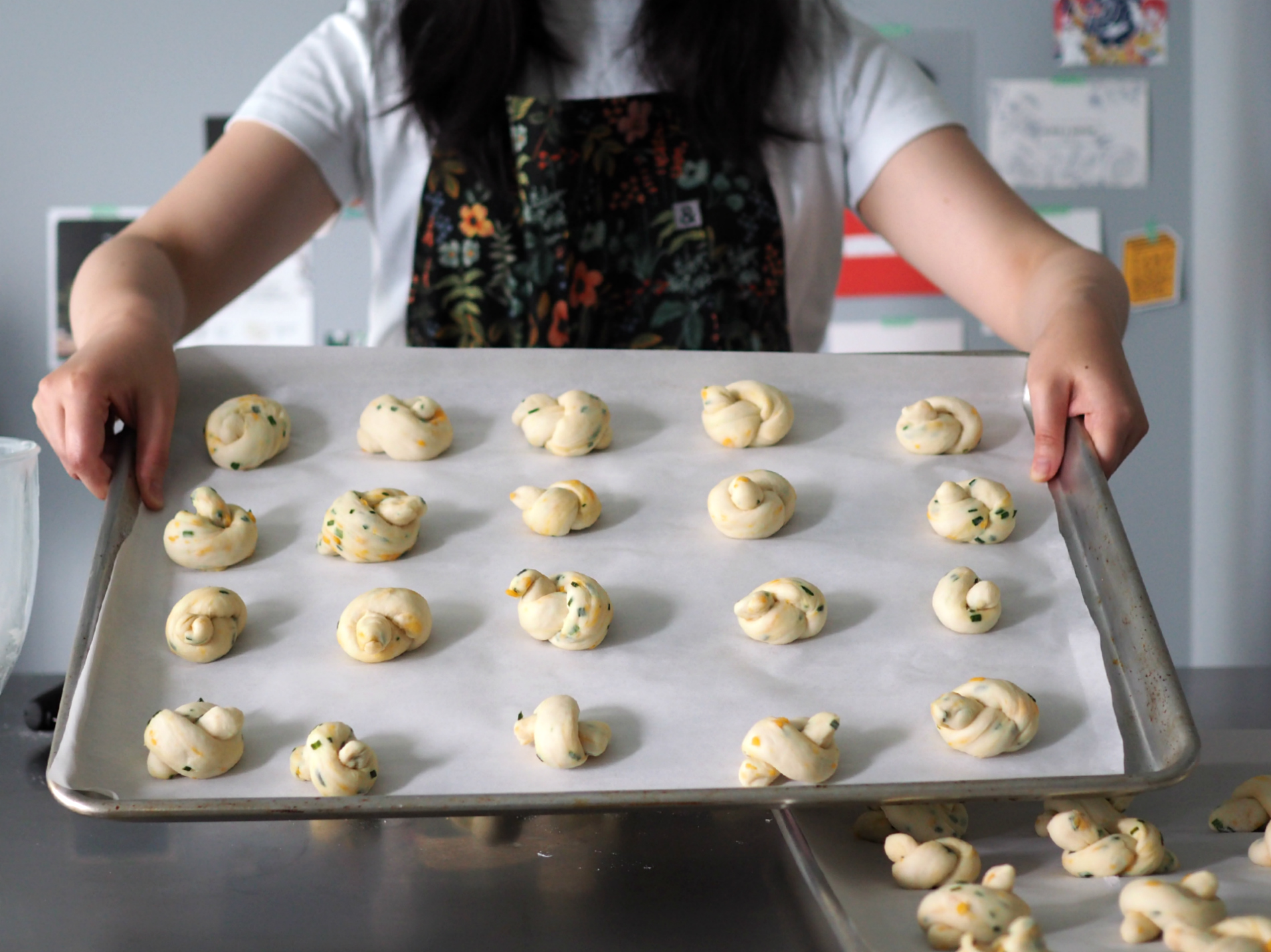 I was able to make at least three baking sheets full of these baby knots. They puff up quite a bit after baking, so make sure you space them out well.