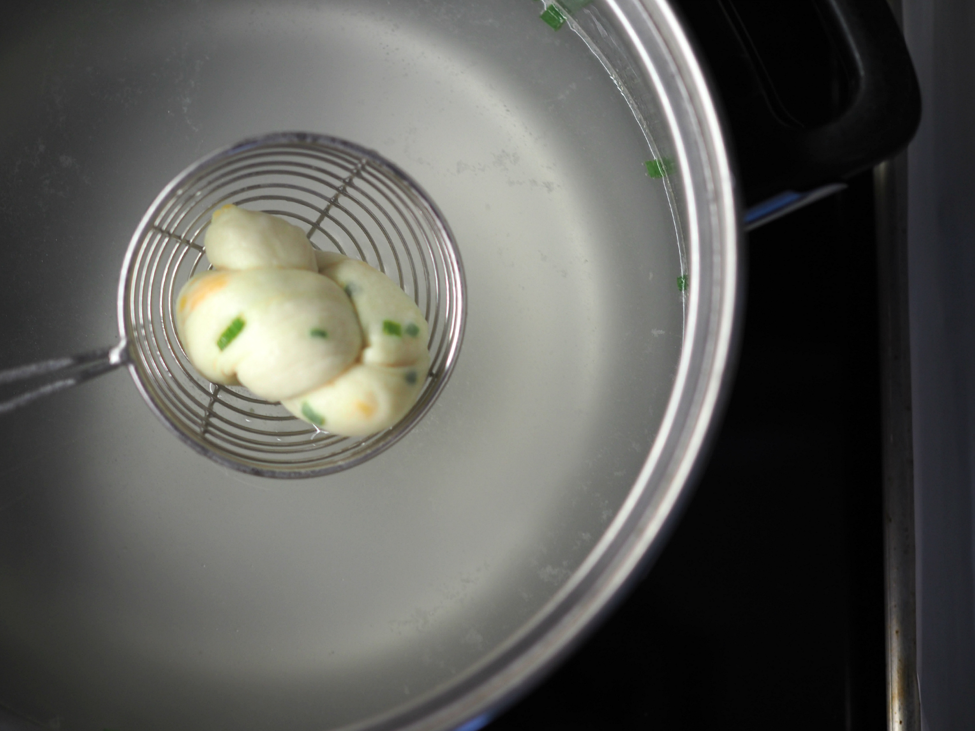 - Working in small batches, put the knots in the boiling water for about 20-30 seconds. Quickly remove them with a slotted spoon or spider. Place them on parchment paper over a baking sheet.