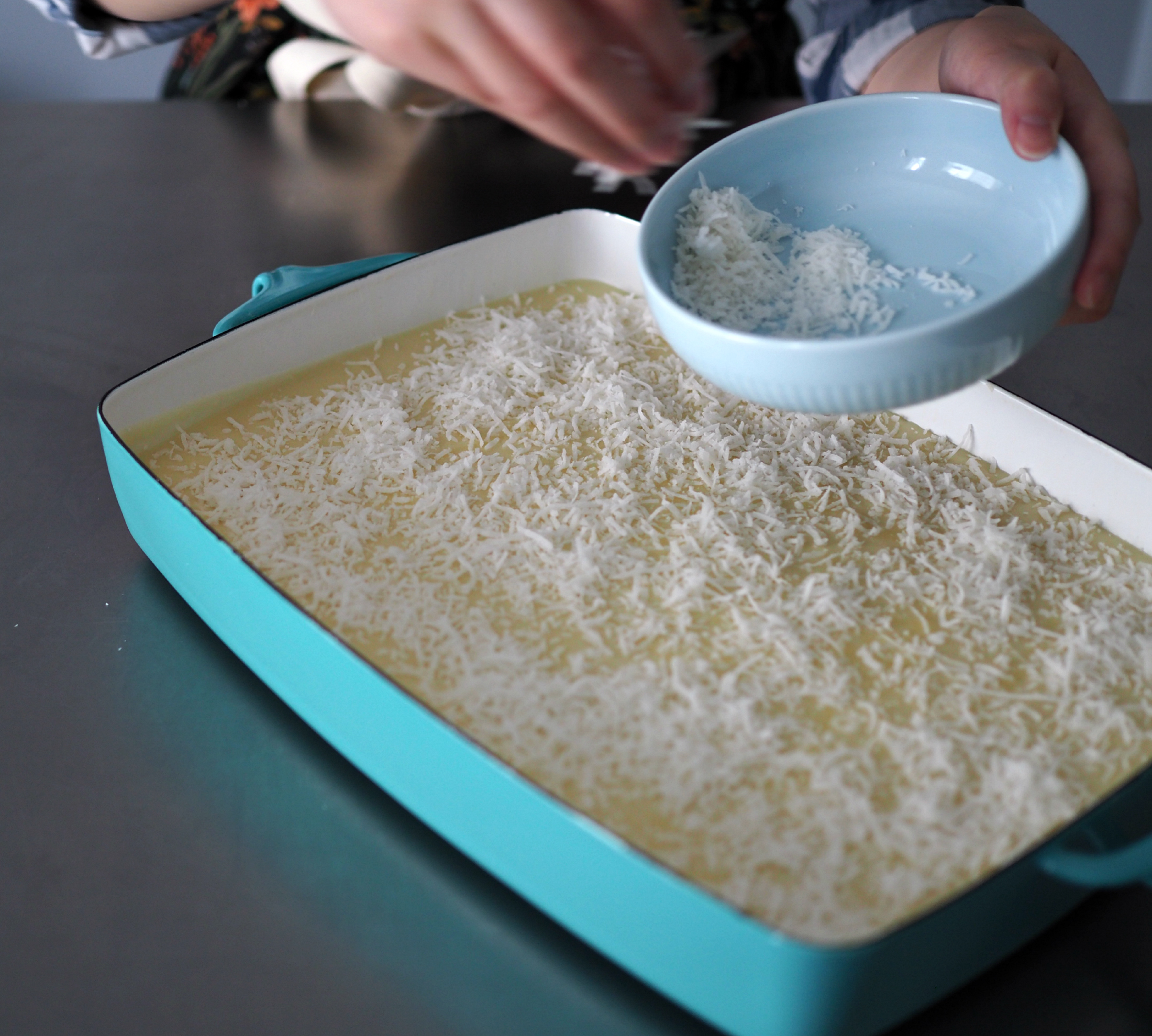 - Then, as the mixer is on the lowest speed, pour in the melted butter until incorporated. Then the coconut milk (the original recipe calls for less). Once it’s all mixed in, pour it into the baking pan.
