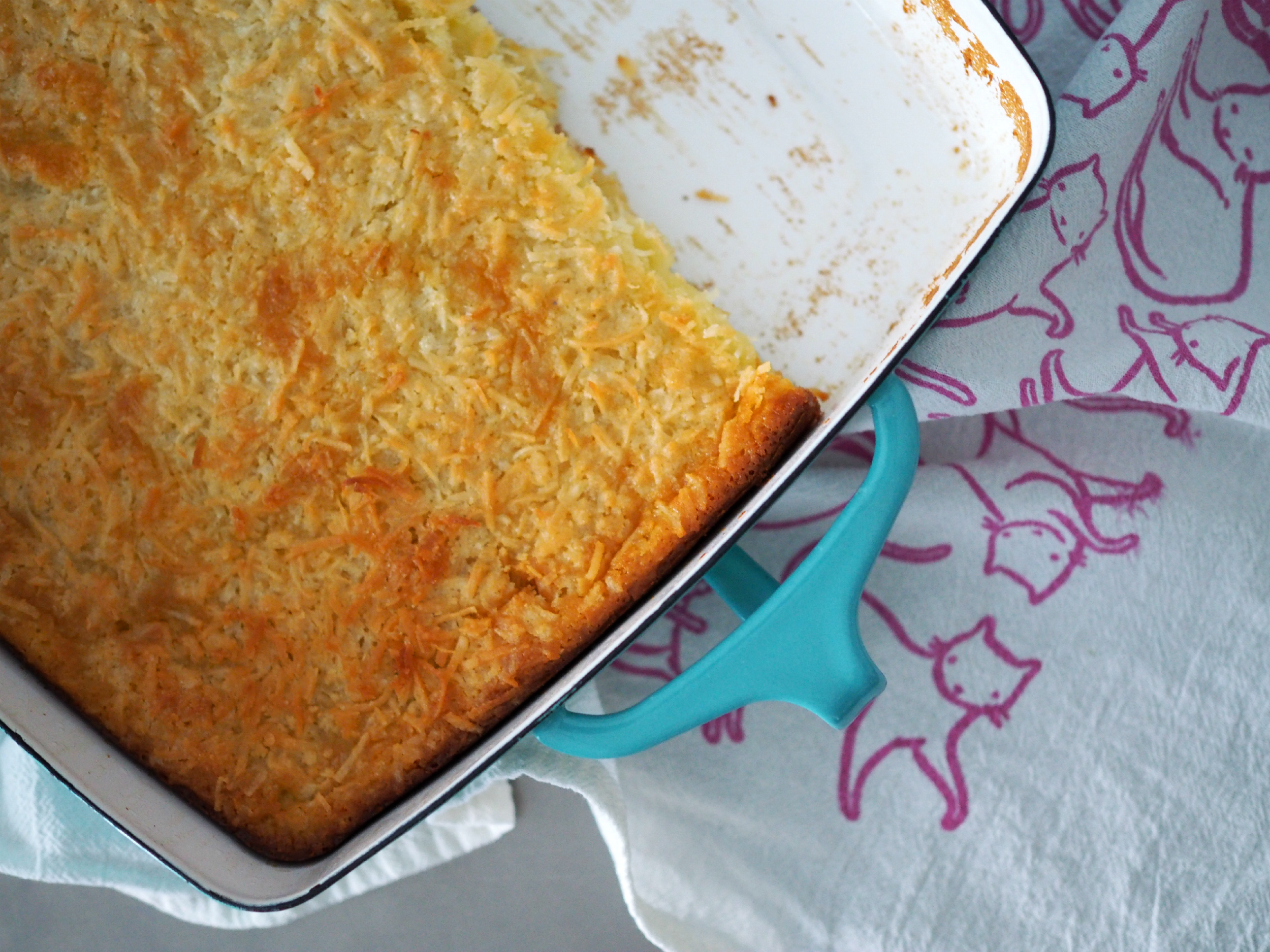 Tastes nothing like a cheesy casserole of course. Just delicious coconut chewiness! The corners and edges are the best because they’re crispy. I stored it in an airtight container and found that the crispiness went away the next day. So keep that in mind if you’re serving it the next day. I hear you can also reheat it for more yumminess.