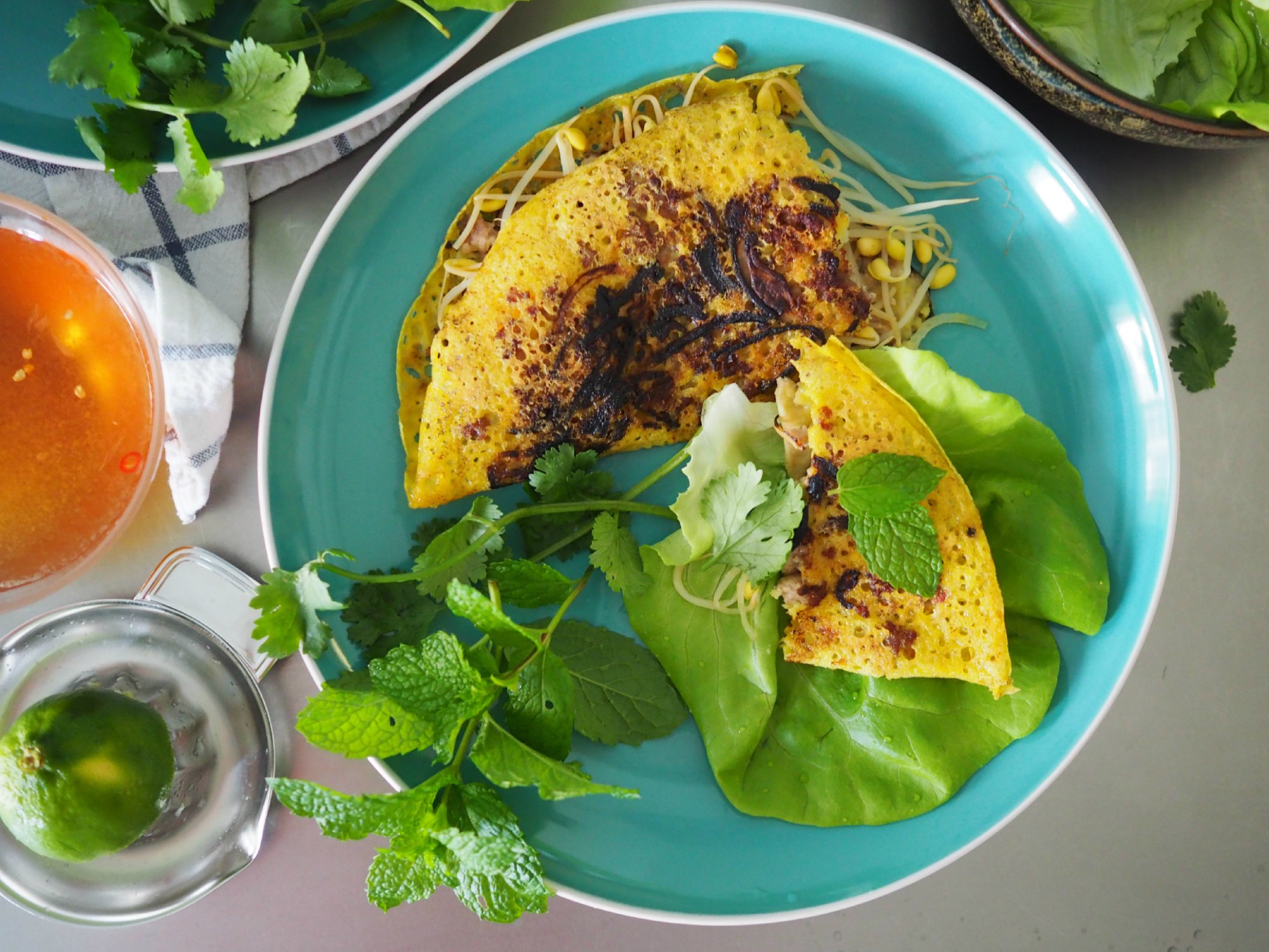 - There are different ways you can eat your sizzling crêpe. First, you can tear pieces of the crêpe and wrap it in lettuce along with fresh herbs like mint, basil, or cilantro. Then dip in sauce before stuffing it all in your mouth.
