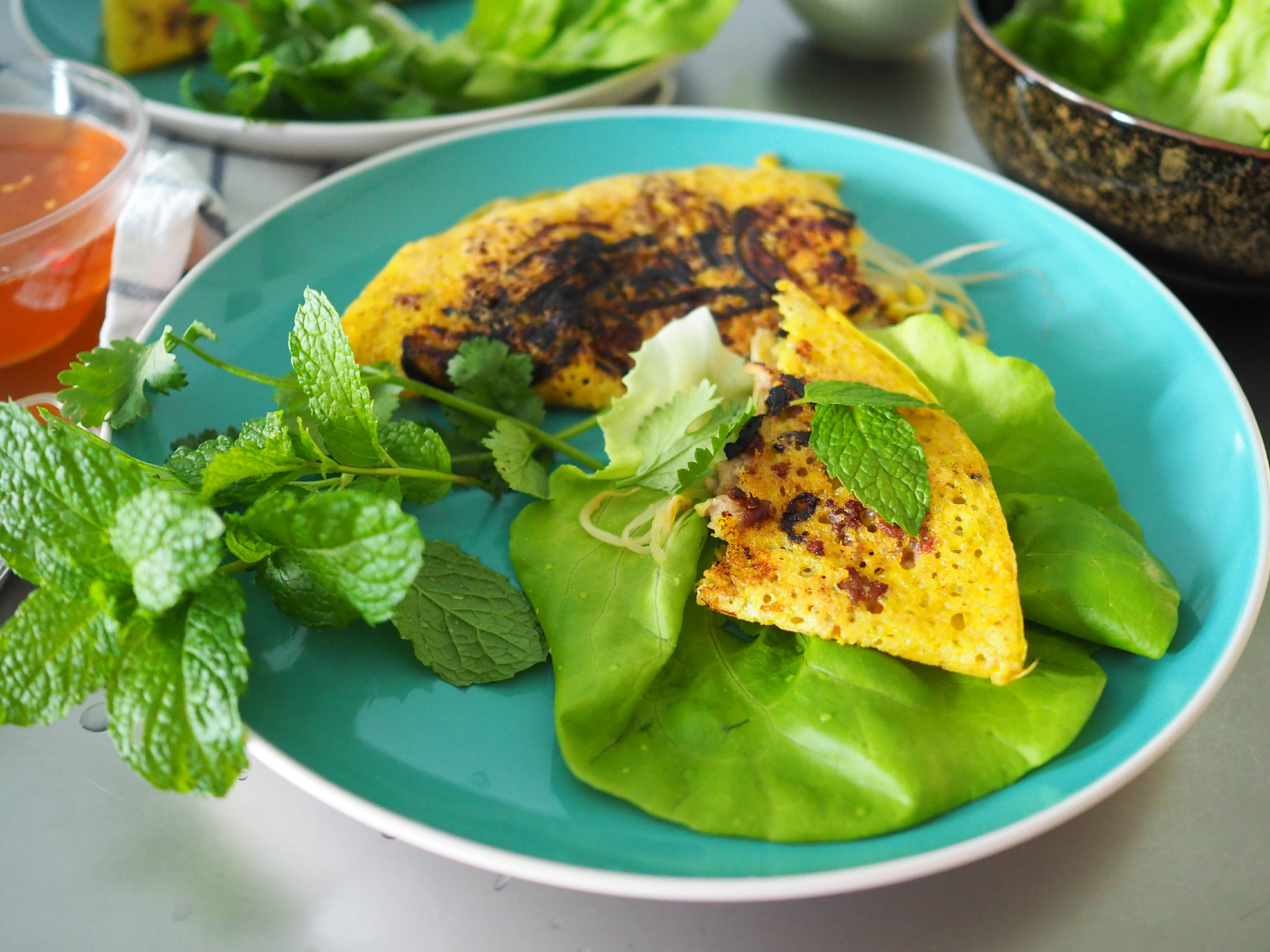 - Or, our favorite way, take out some Vietnamese rice paper. Dip it in hot water and lay it out on a cutting board or plate. Put in the lettuce, herbs, and a piece of the crêpe. Fold in the edges and roll it up. Dip in the sauce before taking a bite.